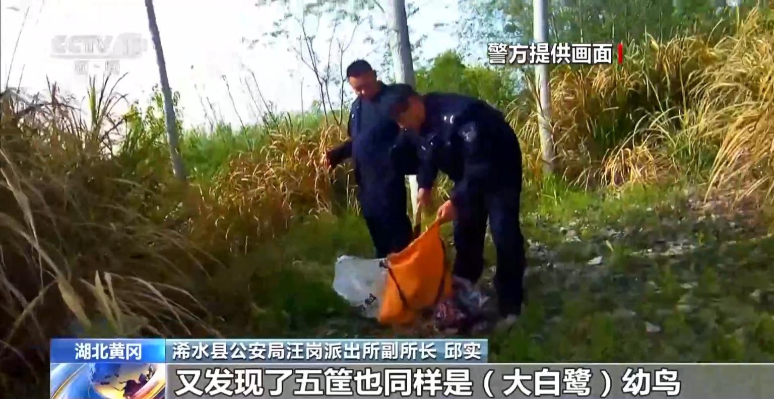 浠水县公安局汪岗派出所副所长 邱实:我们在车辆附近进一步扩大搜寻范围,大概几百米外一个地方又发现了五筐,同样是大白鹭幼鸟。